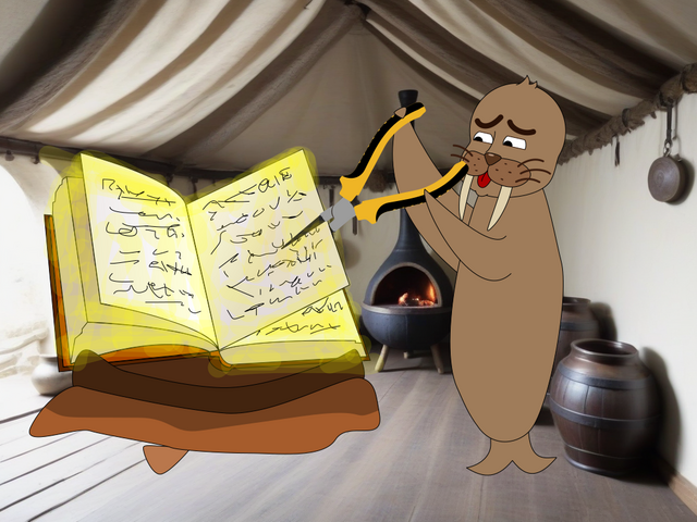 Willy Walrus (w) wants to cook in the encampment's kitchen ((e)n2). The recipe book (文) is extremely greasy and Willy doesn't want it to touch anything, nor touch it. That's why he puts it into a beret (亠) so that it doesn't touch the floor, and uses pliers (乂) to turn the pages.