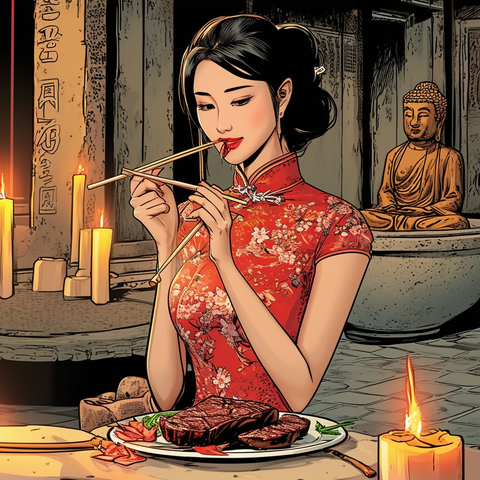 Xi Shi (xi) is secretly eating a steak (丅) in the ashram's bathroom (a4). She uses two flutes (一) as chopsticks and even devours the steak's bones (丨).