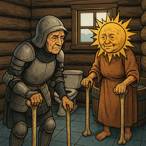 In the year 2076 Joan of Arc (ji) and the sun (日) meet again in the outhouse's bathroom (ou4). They are both very old (旧) and have to use dinosaur bones (丨) as crooks.