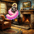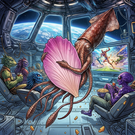 Xi Shi (xi) has gone crazy from the loneliness in space. In front of the space station, she sits inside of a large wooden box, wearing a cowboy hat and playing a 胡兀尔 fiddle, thinking that she's participating in a square dance in the wild west.